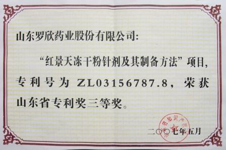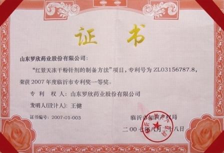 山東羅欣藥業股份有限公司“紅景天凍干粉針劑及其制備方法”項目,榮獲2007年度臨沂市專利獎一等獎,山東省專利獎三等獎。